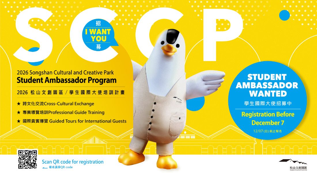 Come and join the Songshan Cultural and Creative Park Student Ambassador Program, you will enhance English speaking proficiency, develop professional guiding skills, and broaden your global perspective in 4 weeks!