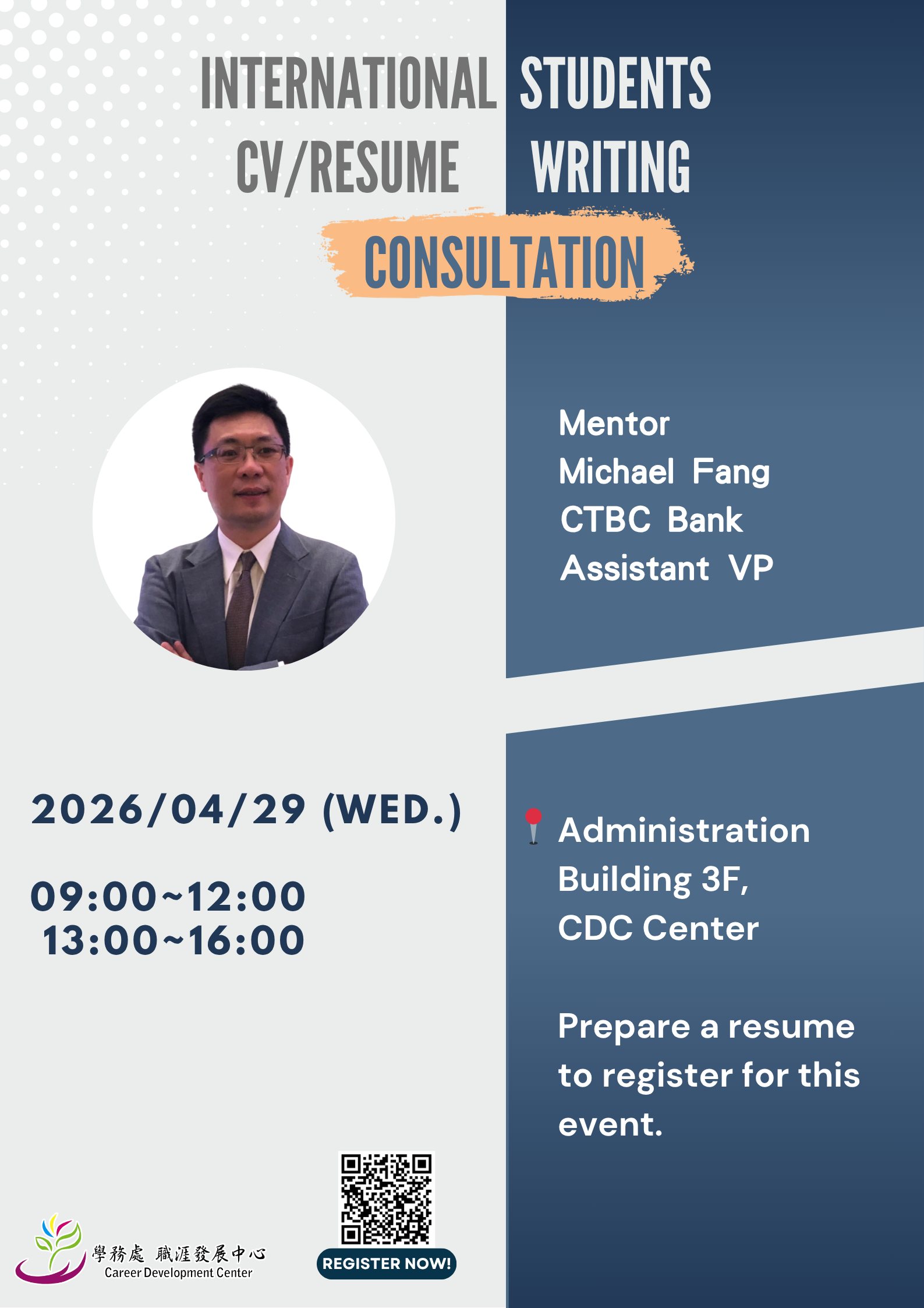 Please E-mail contact the Administrative staff (hc0310@gm.ntpu.edu.tw) to choose the time slots that you can attend.